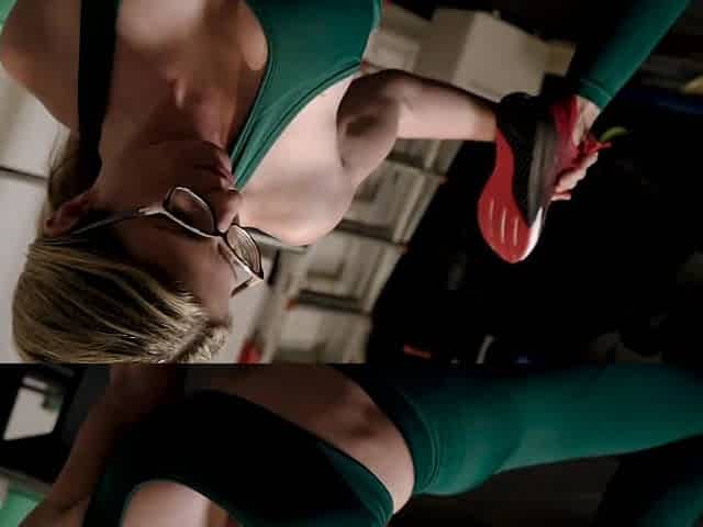 Fit wife Cory Chase with glasses works out in yoga pants at home