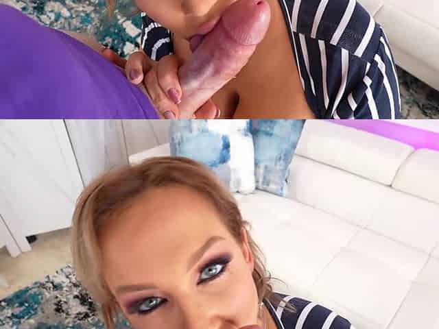 Blonde Addison Lee with pierced navel giving a blowjob in POV