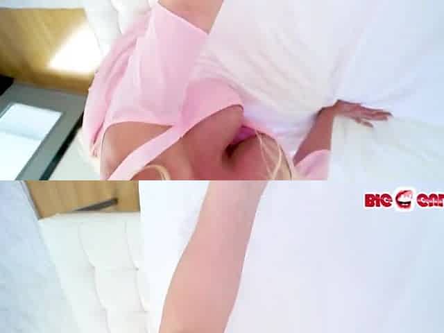Hot Blonde W/ Big Fake Tits Corset Thigh Highs Sucks Dick Deepthroat Spit