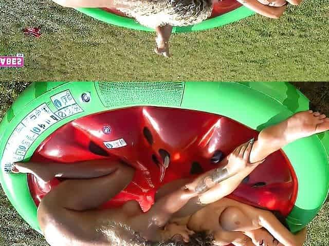 Busty blonde gets a poolside creampie and a cumshot