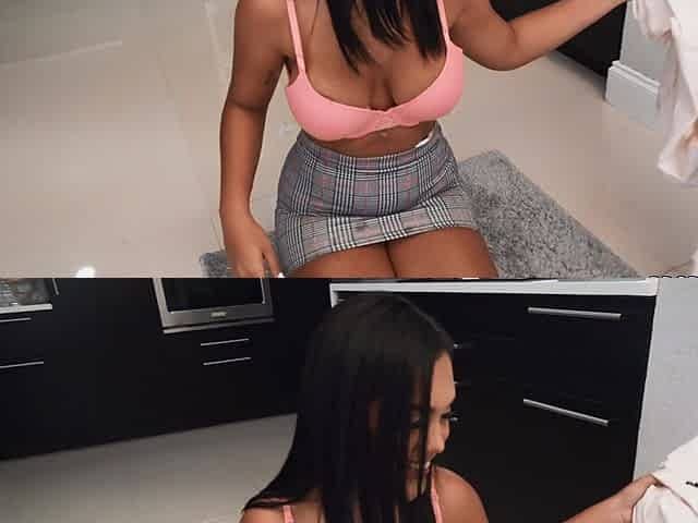 Busty brunette Aline Belle enjoys riding a dick in the kitchen