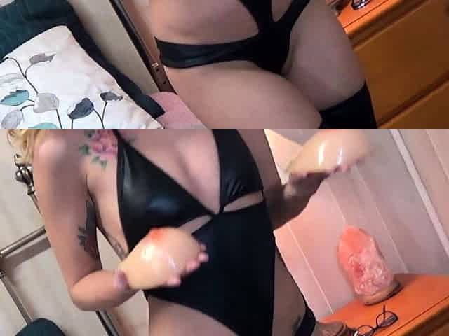 Sissy in chastity in ebony outfit and fishnets riding XL sex tool