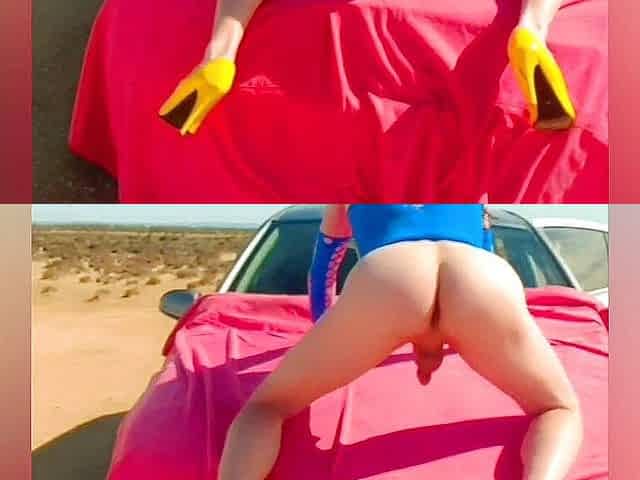 Cute young girl sucks sissy girl Sadee dick in car on a dirt road swallow her load