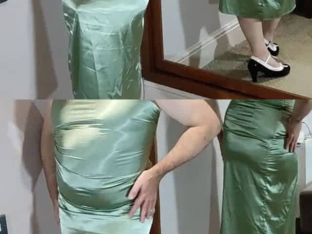 Sexy green satin dress and heels.