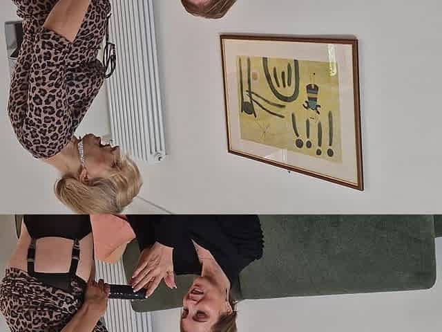 Sissy Lola jupe hot en latex rose monte vigouresement sur son gros god
