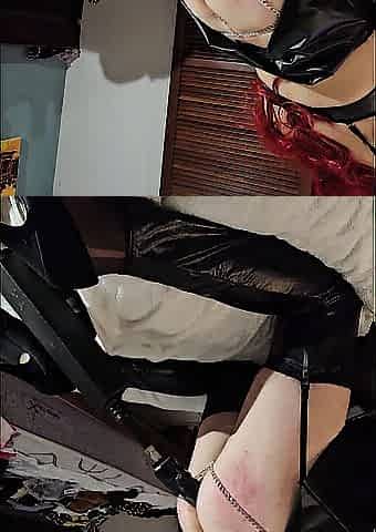 Hawt Sissy lola doll red hair and full red latex high heel ride a large sextoy with chastity