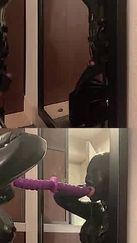 Latex sissy femboy sucks sex-toy during the time that masturbating and cums