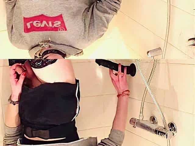 Sissy Cindy exposed while enjoying black dildo in heels and lingerie