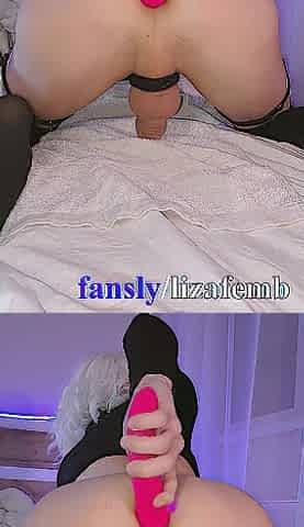A femboy with a sex toy in his booty jerks off his dong and cums