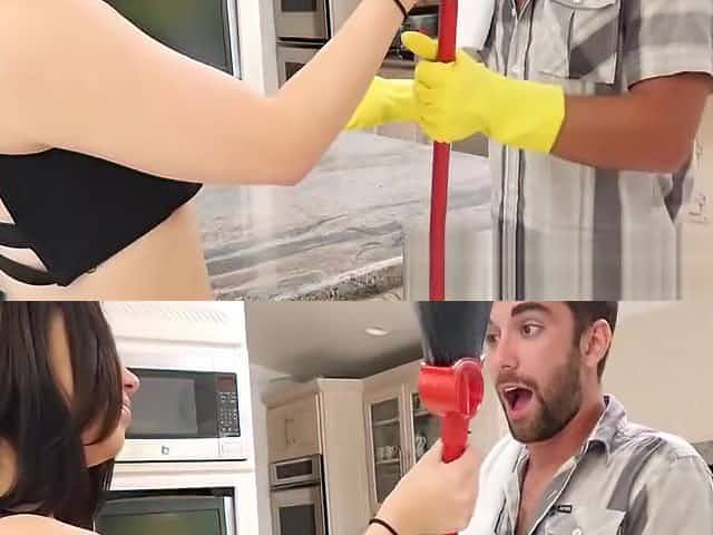 Brunette skank Demi Lowe fucks with her help in the kitchen