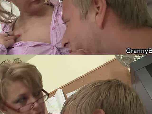 Blonde old women pleases an young guy. Blonde old women pleases an young guy
