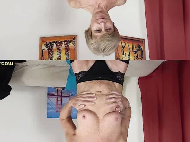 Skinny mature blonde granny Raina W. strips and exposes her mega tits