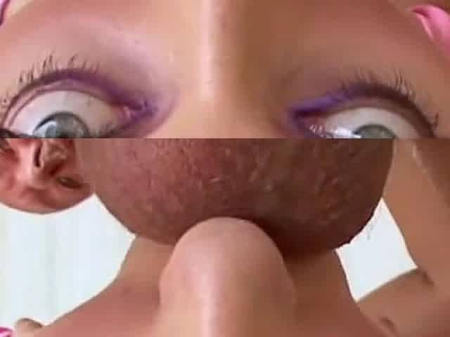 Fake-tit skinny doll Candy Scott penetrated by giant penis from behind
