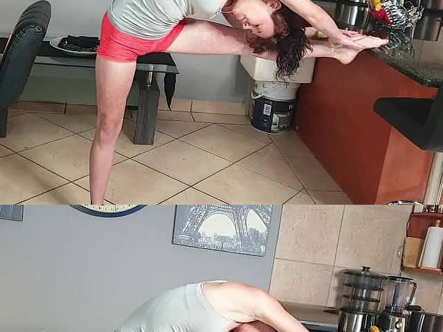 Slender brunette hair pissing in her yoga panties whilst stretching and doing exercises