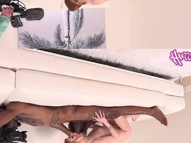 Long-legged blonde MILF poses for a photoshoot with a black stud while others watch