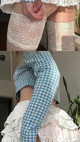 Cross-dressing femboy in short skirt cums all over himself ????