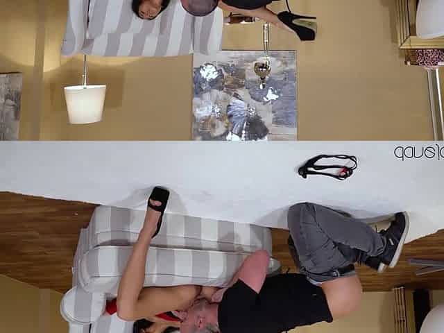 Sexy assistant Kriss Kiss in a latex skirt gives a hardcore bj to a huge cock in the best live show