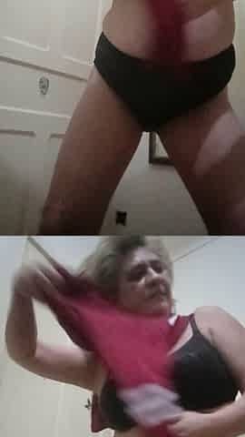 Lifts up a red short petticoat. Masturbation and climax in panty