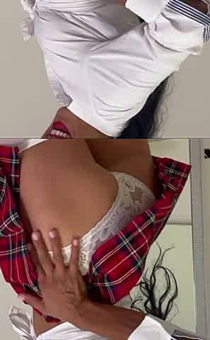 He lifts up the skirt of a girl in uniform, takes off her panties, fingers her, and cums on her face.