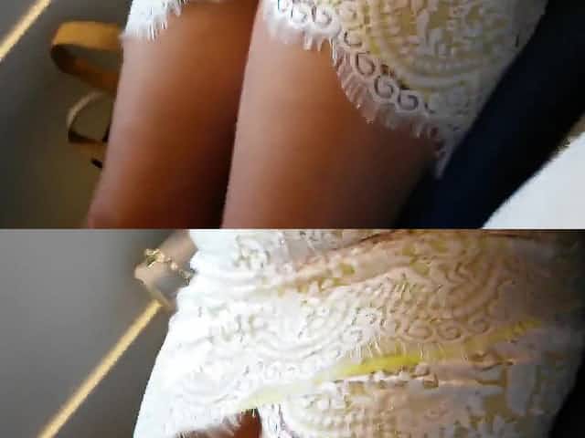 student white short skirt yellow pants upskirt up the bum