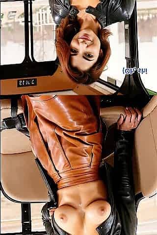 Breasty older redhead in full leather doing pole dance in a bus - AI Illustrated leather porn fantasy