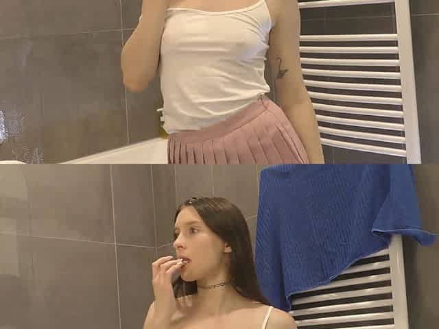 Braless hot brunette babe Jane White shows off her stunning ass and legs in a pink mini skirt while showering