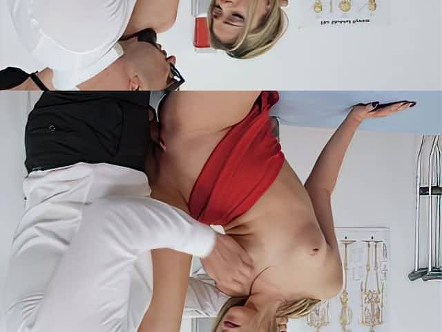 Blonde bitch in a short skirt likes to be pounded in the shaved pussy, from the back