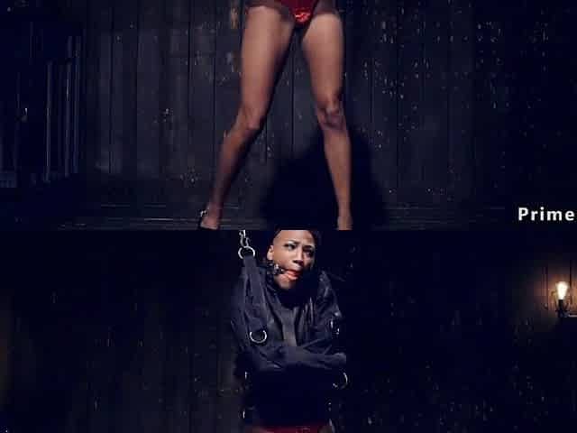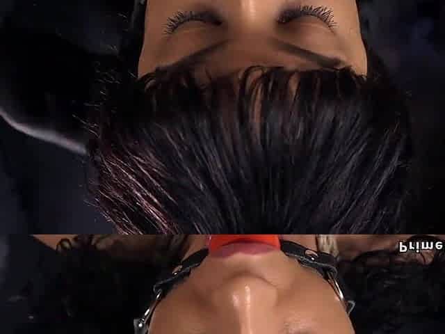Gagged black thrall in backbend slavery whipped and made squirt on own face