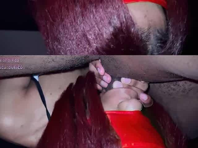Skinny ebony with big tits sucks big cock