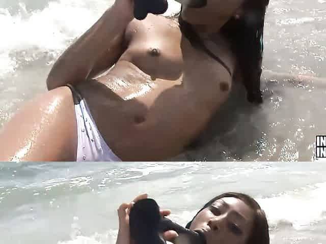 Elegant ebony model Jayla Foxx plays with her pussy on the beach