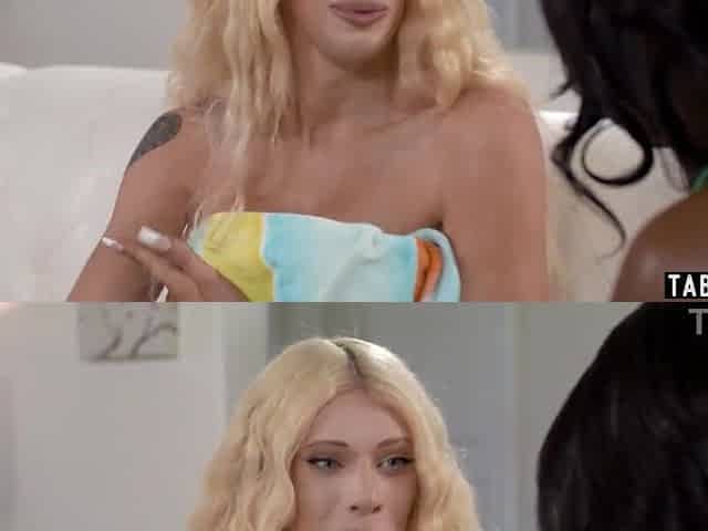 Breasty blond tgirl banging a hot ebony MILFs soaked darksome cunt