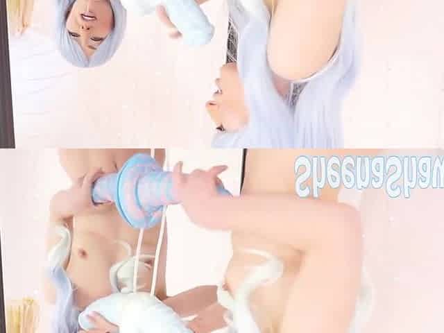 Stepsister gives wet and sloppy blowjob with a dildo, then takes my cock in the shower.