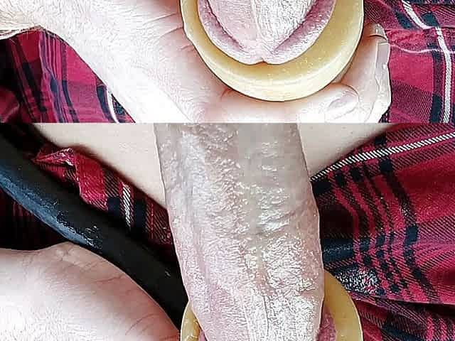 Sloppy spitjob on big mushroom cock followed by creamy cum