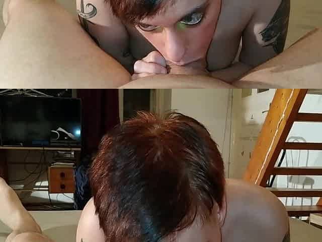 Sloppy blowjob & ball licking by a huge titted sub slut full