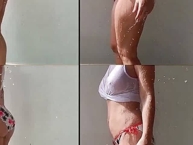 "Sexy wet white shirt getting hosed down in slow motion"
