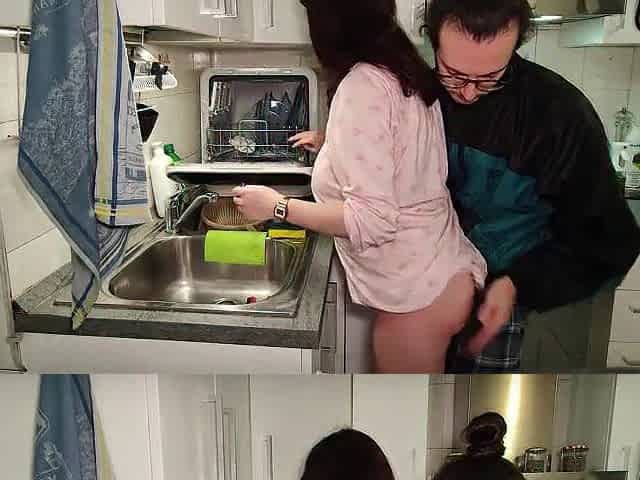 Preggo woman does tit jack off in the kitchen after washing the dishes