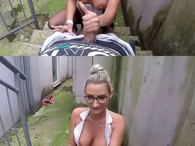 Cindy Behr - Busty Blonde Bitch Is Smoking A Cigarette, While Rubbing A Thick Cock Between Big Boobs