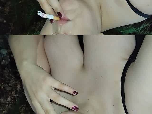 Topless babe uses herself as a human ashtray while smoking a cigarette