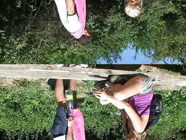 The blonde smokes a cigarette in the countryside, a guy passes by and puts his hard cock in her mouth