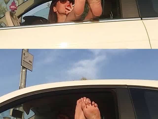 Tattooed blonde beauty smokes a cigar and plays with her feet