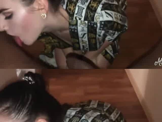 Smoking hot brunette is giving a sensual blowjob before bending over for pussy penetration