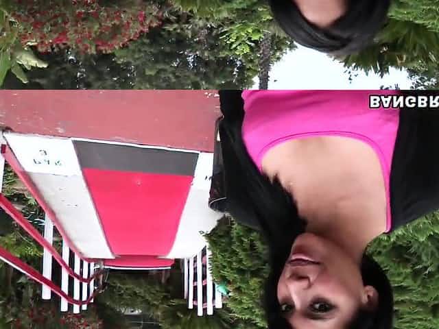 Busty Crazy Maria on balcony show tits and smoking cigar