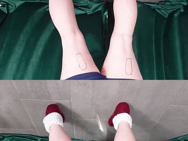 Flexing Muscular Calves in Thick Burgundy Socks with White Cuff