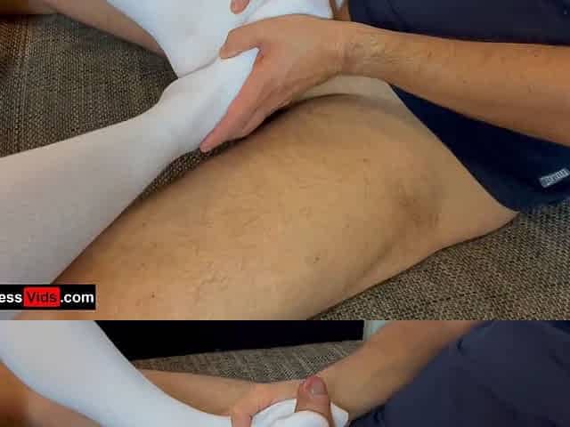 Mean Brenna Pepper Wants to Torment & Jerk Off Lance's Cock, Brenna Pepper is wearing a leotard, shiny tights and white socks. S