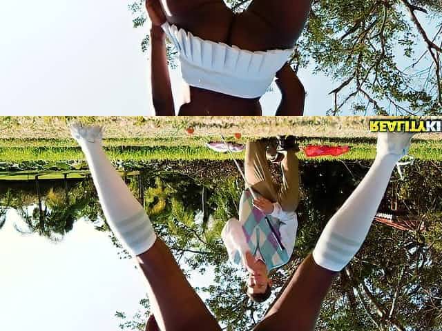 Hot White chick in knee socks has sex with a Black couple