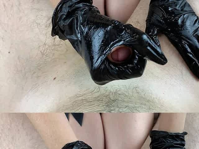 Attractive Girl Masturbates Her Boyfriend Wearing Black Gloves and Helps with Her Feet in Socks