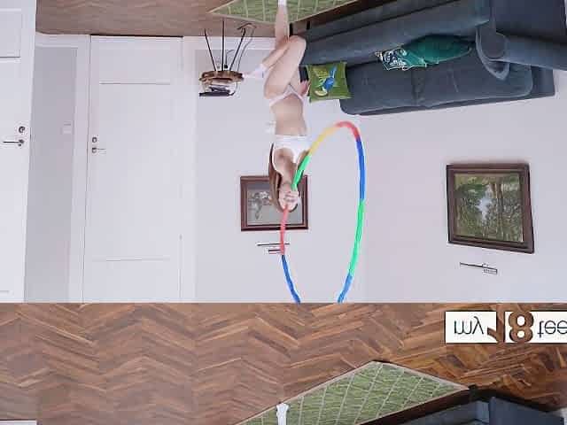 Girls Only Apartment in Japan, Skinny Girl Doing Seduce Fitness in Apron-type Mini Student Uniform, Thong Panties, White Socks