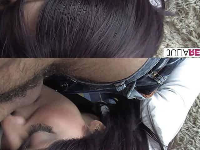 Sexy Taylor Cross gives a great foot job and guy cums all over her feet on sofa