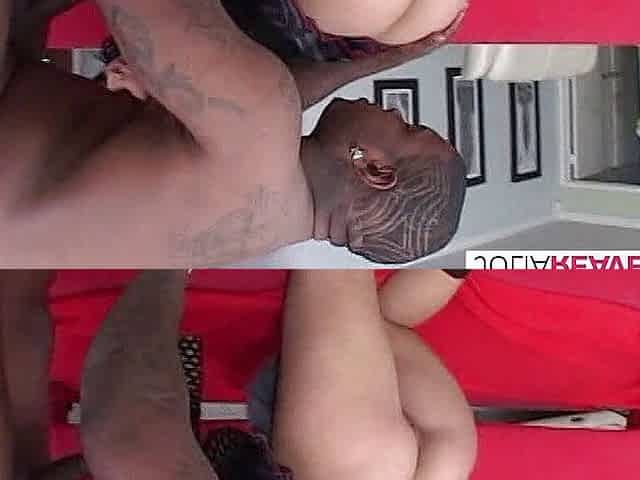 Busty black bitch gets her cunt rammed by a white tool on the sofa