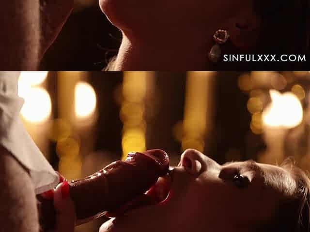 Gorgeous blonde sucking her boss's dick on the sofa - Sandra Star